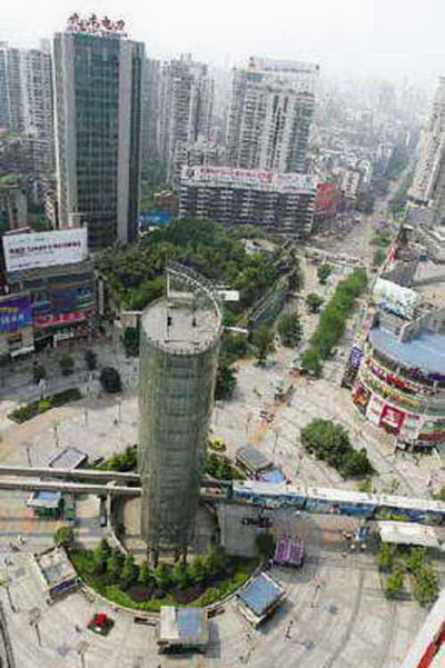 網友“趙眼鏡”稱,楊家坪輕軌上那個玻璃塔,楊家坪的人都叫它是:倒扣的水桶。
