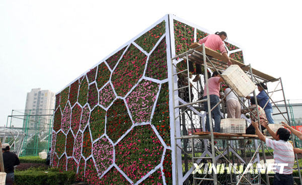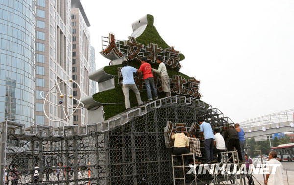 9月5日,工作人員在北京東單路口搭建“水立方”造型花壇。新華社發(fā)(陳曉根