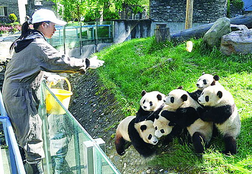 臥龍中國保護大熊貓研究中心的工作人員與大熊貓 新華社