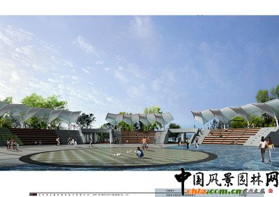 和諧廣場延續了"天圓、地方"的發展理念,構成了"人和"的意境,一方面體現了"天、地、人"的和諧統一,另一方面體現了國內外參展城市歡聚一堂的融洽氛圍,形成了入園后景觀序列的高潮。和諧廣場為下沉式廣場,四周是階梯式的觀演臺,可容納觀眾,中間是圓形的下沉廣場,可作為演出舞臺,這里是園博會期間舉辦活動、進行演出的主要場所。觀演臺外側設有紀念品銷售、餐飲等綜合服務設施,是園內主要的購物、休憩場所之一。