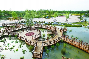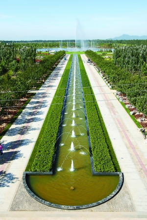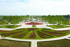 京華園以植物造景為主,栽有各類苗木70多個(gè)品種2000多株,月季、菊花8000多株,其他花卉60多個(gè)品種26000多株,草坪900平方米。園內(nèi)地形高低起伏,層林疊翠,除菊花和月季的栽植貫穿全園外,還有抽象的月季花形的鋼橋,以曲線的柔美,營(yíng)造似穿行于花瓣中的意境,菊花形流水將菊花弧線的自然美與水流的靈動(dòng)巧妙地結(jié)合在一起。