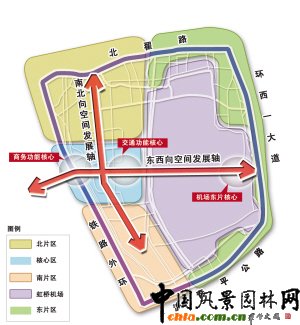 而根據(jù)現(xiàn)有規(guī)劃,虹橋商務(wù)區(qū)26.3平方公里的總體布局是“一環(huán)、兩軸、三核、五區(qū)”。一環(huán),指外圍由公共綠地、防護(hù)綠地、河流水域等形成的生態(tài)綠環(huán),是虹橋商務(wù)區(qū)生態(tài)品質(zhì)的保障。兩軸,指東西向空間發(fā)展軸和南北向空間發(fā)展軸,為這一區(qū)域發(fā)展的基本構(gòu)架。三核,指由東西向空間發(fā)展軸串聯(lián)的三個(gè)重要功能核心。其中,交通功能核心由虹橋機(jī)場西航站樓、鐵路虹橋站、軌道交通、公交巴士站和地下停車庫等構(gòu)成的樞紐功能綜合體,是虹橋商務(wù)區(qū)最重要的功能構(gòu)成要素和服務(wù)長三角的動(dòng)力之源;商務(wù)功能核心則位于交通功能核心西側(cè),主要布局與樞紐功能密切相關(guān)、服務(wù)輻射長三角的商務(wù)辦公、文化、交流功能,是虹橋商務(wù)區(qū)建設(shè)的活力之源;機(jī)場東片核心是指虹橋機(jī)場航站樓及周邊商業(yè)、商務(wù)、行政辦公等形成的片區(qū)功能核心,帶動(dòng)機(jī)場東片的改造和更新,完善加強(qiáng)樞紐服務(wù)功能。五區(qū),指按照功能布局形成的核心區(qū)、虹橋機(jī)場、北片區(qū)、南片區(qū)、東片區(qū)等五個(gè)不同功能板塊。