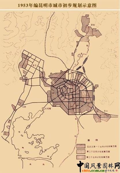 昆明市為適應(yīng)第一個五年計劃的需要,在分析研究1955年前各次規(guī)劃資料的基礎(chǔ)上,編制完成了《昆明市城市初步規(guī)劃設(shè)計》。