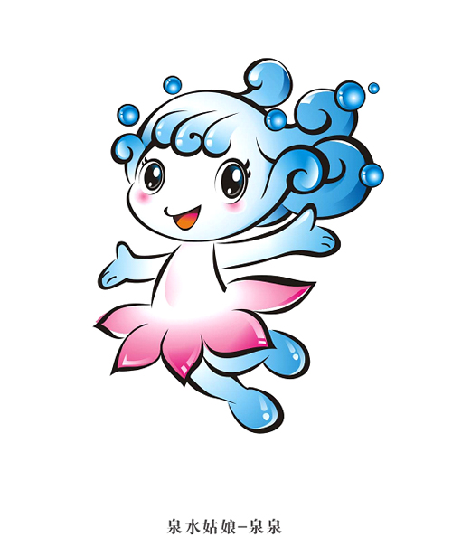 吉祥物“泉泉”采用了擬人化的手法,將泉水和荷花結合形成形象主體。吉祥物形象以泉水和水花組成女孩的頭發,突出了濟南泉城的地方特點。荷花是濟南市的市花,以荷花的花型變化成女孩的長裙,表現出濟南泉水和荷花相映的美麗景色。