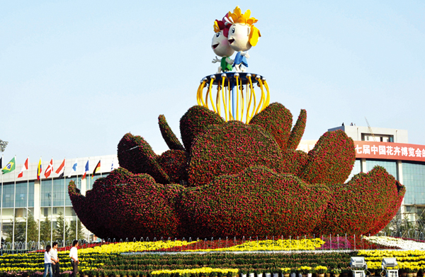 “七博會”舉辦地青州市在國際會展中心廣場布置搭建了一座23.8米高的巨型牡丹花卉造型,為慶祝新中國成立六十周年和即將召開的第七屆中國花卉博覽會營造了濃厚的喜慶氛圍。