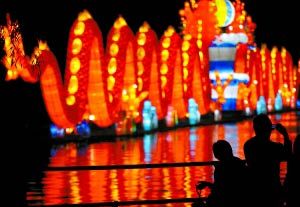 本次燈會聘請了四川自貢的花燈制作人員,根據(jù)公園空間布局。“天涯共此時”燈組將鮮花、嫦娥、圓月等中秋元素融到了一起,“月韻金秋”燈組以古代屏風(fēng)式造型,配以仕女的美麗圖片,將游人帶入古時中秋佳節(jié)人們過節(jié)賞燈的情景當中。