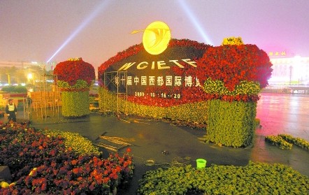昨晚,綠化工人在天府廣場搭建植物雕塑,擺出西博會的會標。為了迎接西博會,市林業和園林局在新會展、天府廣場等地設置了18組大型植物雕塑。在人民東路,西博會的植物雕塑是在迎國慶的植物雕塑的骨架上稍加改動,以免浪費。
