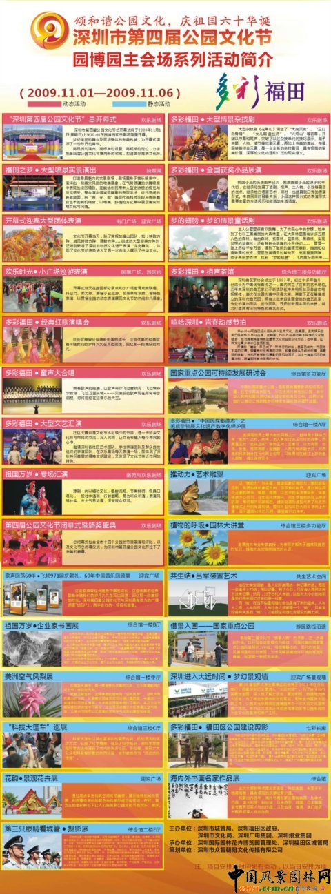 09年福田區(qū)政府將作為園博園主會場活動的共同主辦單位,全面參與公園文化節(jié)主會場活動的組織工作,向市民呈現(xiàn)高品質的活動項目。具體內容有:福田之夢·大型噴泉實景演出、多彩福田·社區(qū)大型文藝匯演、多彩福田·相聲茶館、多彩福田·童聲大合唱、多彩福田·經典紅歌演唱會、多彩福田?大型情景雜技劇、多彩福田?全國獲獎小品展演。