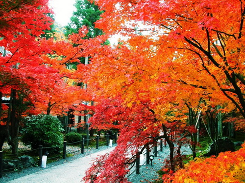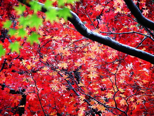 原來綠色植物的葉片里含有多種色素,這就是葉綠素、葉黃素、胡蘿卜素、類胡蘿卜素和花青素等。在植物的生長季節中,由于葉綠素在葉片中占有優勢,所以葉片保持著鮮綠的顏色。到了秋季,氣溫下降,葉綠素合成受阻,遭到的破壞則與日俱增,所以含葉黃素、胡蘿卜素多的葉片就呈黃色。紅葉樹種此時在葉片中產生了一種叫花色素苷的紅色素,所以葉片呈現出美麗的紅色。