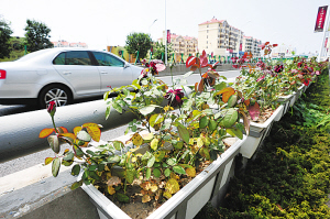 園林部門對福寧立交橋、海信立交橋、海爾路—遼陽路立交橋等進行了立體綠化嘗試,其中福寧立交橋、海爾路—遼陽路立交橋采用的是懸掛花箱的形式,海信立交橋則采用布置花柱、栽植攀援植物等形式。