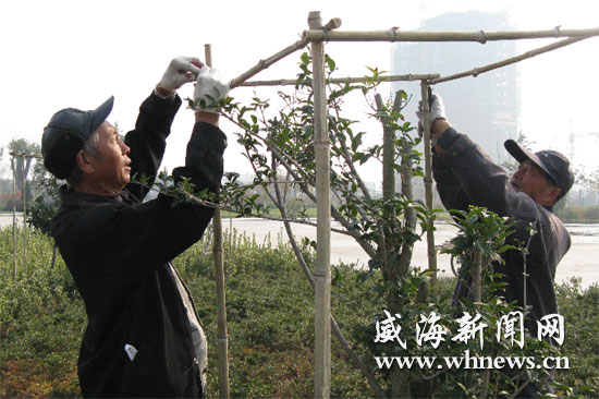 為保證樹能夠安全過冬,日前,文登市園林局開始對(duì)所有的樹木進(jìn)行涂白,并給今年新栽種的不耐寒的花木、喬木及類進(jìn)行包干、設(shè)立擋風(fēng)屏障。圖為11月6日,工人們正在為樹木搭建擋風(fēng)的架子。 (記者 陳婷 攝)
