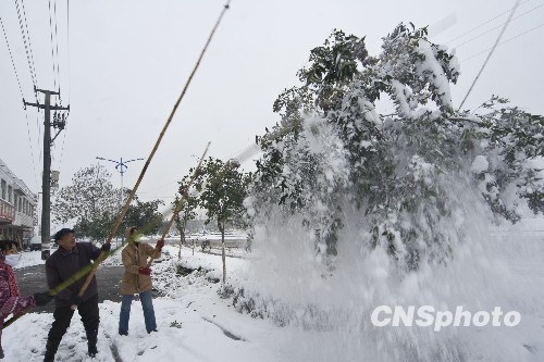 2009年11月12日下午,濟南市平陰縣園林工人清理街道兩側樹積雪,為樹木減負,確保減少暴雪給園林樹木帶來的災害。當日,濟南遭受五年來最大一次降雪。中新社發 俄國慶 攝