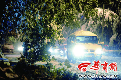 11日晚,西安市含光北路,大雪將樹枝壓彎,搭在路上本報(bào)記者趙彬攝