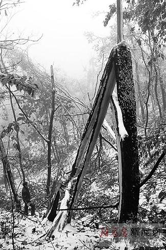 昨日是封山后的第3天,記者來到金頂山景區時,這里仍是一片冰凍世界,成片的林木被覆冰攔腰折斷。有的林木被連根拔起,倒伏在山間和路邊。冰災前還是郁郁蔥蔥的森林只剩下殘缺的樹桿,景象十分凄慘。