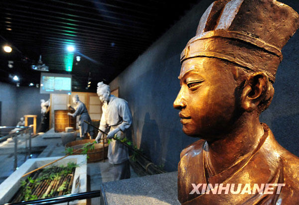 中國文字博物館內的蔡倫塑像與再現當年蔡倫發明造紙術的場景。