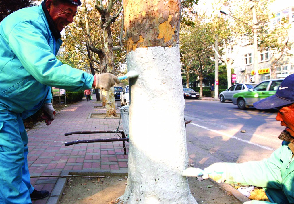 11月23日下午,在高郵湖路上,青島市南園林綠化公司的兩名工作人員正在對行道樹的樹干進行粉刷。據(jù)介紹,他們粉刷用的這種“白灰”,是用石灰、鹽、食用油、水等調(diào)成的“防護服”,均勻涂抹在樹干下部,既能防寒,還能防蟲。記者  張偉