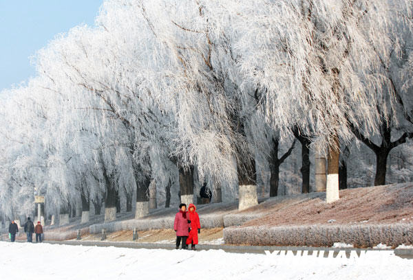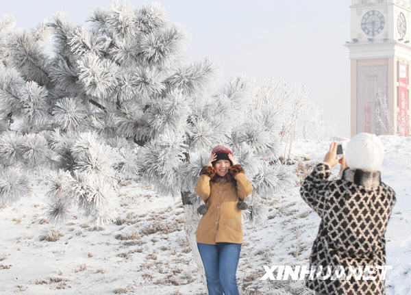 12月1日,兩名市民在霧凇美景前拍照。新華社記者 徐家軍 攝