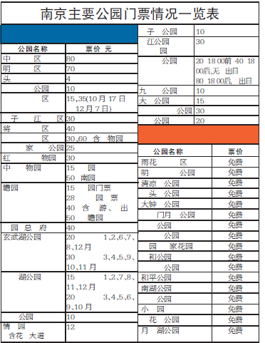 本網昨日報道了《瞻園兩售票處票價不同》一文,報道了游瞻園有四個價格,兩個售票處因為包含的游園服務不一樣,因此價格也不一樣,粗心的游客一不小心就買了“高價票”,惹來游客一頭惱火。昨日本網熱線96096繼續接到不少讀者關心公園票價,“近期天氣涼爽,想周末帶著孩子出門游玩。”南京市民陳女士說,特別是上周六本網報道玄武湖將來有望免費開放的消息讓家人很興奮,想知道南京現在主要有哪些免費開放的公園?主要公園的票價是多少?記者昨日打探了一番,現將主要公園的收費情況公布。     (王亞楠 楊 娟)