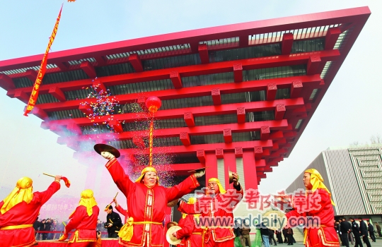 何鏡堂:沒有測過風水,風水是見仁見智的,如果你站到這里感到舒服,那就是風水好吧。整個建筑是按照中國傳統的坐北朝南九宮棋盤式布局的。先前的設計是和對面馬路平行。我們調整了原方案,現在的中國館坐北朝南,位于世博園區南北、東西軸線交會的核心區。