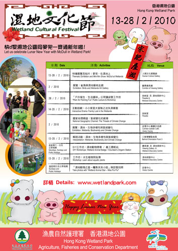 此外,公園將提供一連串的娛樂節目及精彩活動,包含啟發心靈的戲劇、交互工作坊、“濕地、生物多樣性與氣候變化”展覽及“濕地藝術走廊”。濕地文化節為訪客提供一個與別不同的賀歲好去處。