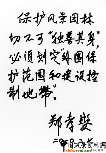 中國(guó)風(fēng)景園林網(wǎng) 近日,我國(guó)著名古建筑保護(hù)專家、歷史文化名城倡建者鄭孝燮先生為中國(guó)風(fēng)景園林網(wǎng)題詞,他表示,保護(hù)風(fēng)景園林是一項(xiàng)綜合性的工作,必須劃定“外圍保護(hù)范圍和建設(shè)控制地帶”。