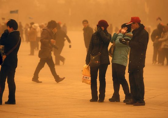 沙塵天氣影響范圍20日繼續(xù)東移,新疆、青海、內(nèi)蒙、甘肅、寧夏、京津地區(qū)、河北、山西、陜西、河南、山東、江蘇、安徽、湖北、四川16省區(qū)市都受到沙塵天氣影響。中央氣象臺專家說,這次沙塵天氣是自2009年1月份以來影響中國范圍最大、強(qiáng)度最強(qiáng)的沙塵天氣過程。