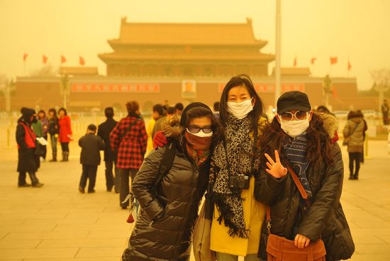 20日,幾名游客在沙塵籠罩的北京天安門廣場戴著口罩留影。新華社發(fā)