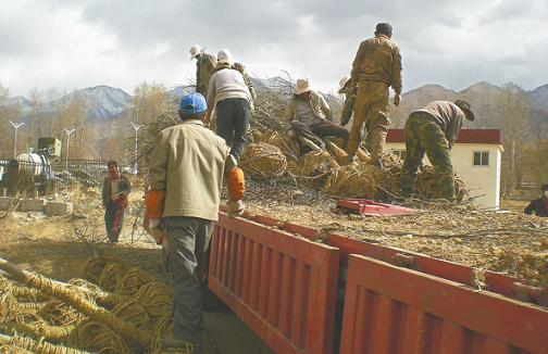 記者在拉薩市園林局苗木基地看到,園林工人正從車上一棵一棵地向下卸剛從河南運回的白玉蘭。每棵白玉蘭的根部都包裹著泥土,外面還用棕繩緊緊地纏著。園林工人說,樹根上包裹著泥土,是為了防止苗木在運輸過程中失水過多而導致死亡。