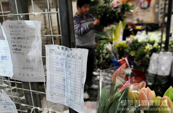 3月22日,新疆明珠花卉市場一花店的發貨單上,顯示著偏高的花卉價格。