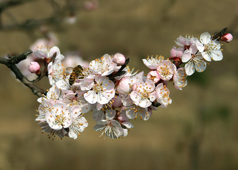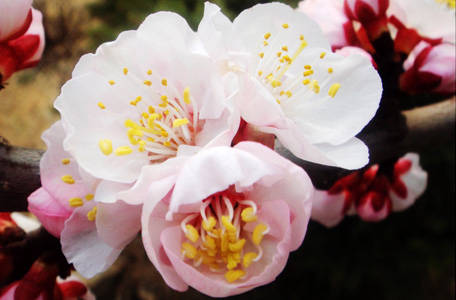 北京八達(dá)嶺長(zhǎng)城四周山坡上栽有上萬畝杏樹,每逢清明前后杏花次第開放,杏花花期只有10天左右,風(fēng)雨后即飄零。