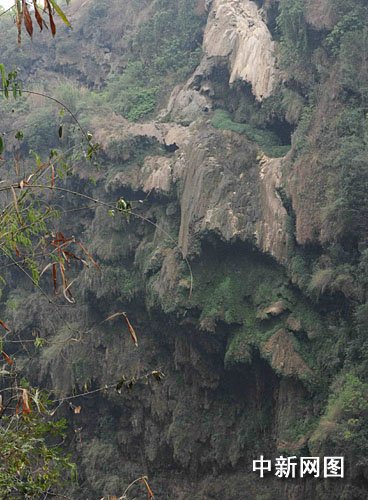 3月28日,馬嶺河大峽谷內(nèi)的“七彩瀑布”受干旱影響斷流,露出鈣化群,其表面的青苔也全部枯死。攝影:曹多然