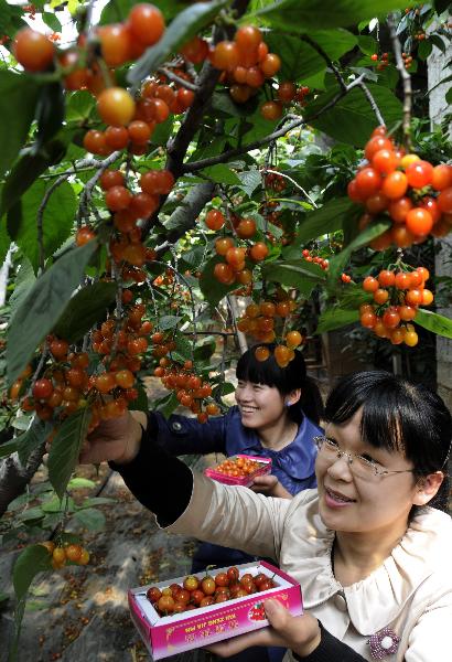 4月3日,游客在山東省棗莊市山亭區寺溝村農家櫻桃大棚內體驗收獲的樂趣。新華社發(李宗憲 攝)