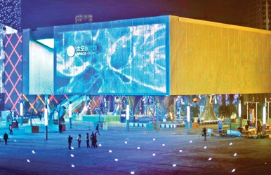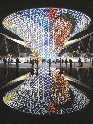 游客在世博軸體驗變幻多彩的燈光效果(南國早報)
