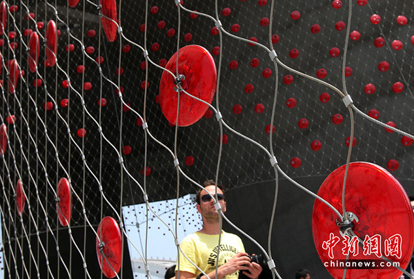 5月2日,上海世博會是第一個正式提出“低碳世博”理念的世博會,圍繞著這樣的理念,上海世博園區內的低碳元素比比皆是。圖為瑞士館用大豆纖維制成的紅色幕帷,能發電,可天然降解。中新社發 湯彥俊 攝