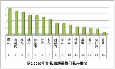 如圖2.所示,2010年春季花卉旅游熱門花卉按熱門程度由高到低的順序依次為:櫻花、油菜花、梅花、桃花、郁金香牡丹、杜鵑花、茶花、杏花、禾雀、海棠、玉蘭、向日葵、玫瑰。其中油菜花的熱門程度較去年春季有大幅度的上升,這與近年來農(nóng)業(yè)旅游發(fā)展迅速有一定聯(lián)系。