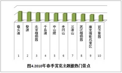 如圖4所示,2010年春季花卉旅游的熱門景點依次為黿頭渚、婺源、北京植物園、千島湖、中山陵、井岡山、三清山、武漢植物園、康定情歌風景區(qū)和百萬葵園(數(shù)據(jù)來源:同程網(wǎng)景點門票在線預訂系統(tǒng))。其中,花卉景點的熱門程度與對應(yīng)的花卉品種的熱門程度具有一定聯(lián)系,如黿頭渚的櫻花、婺源的油菜花等。