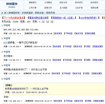 在某網(wǎng)站“棕櫚園林股吧”中,一份“中簽號曝光貼”在6月2日的凌晨4點59分48秒發(fā)表。