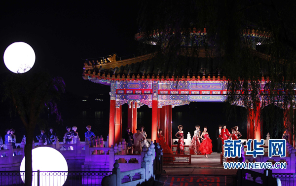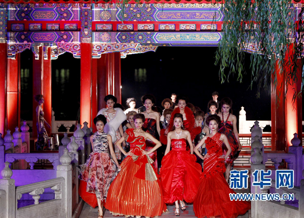 6月12日,模特在北京北海公園五龍亭舉辦的時尚秀上展示時裝。