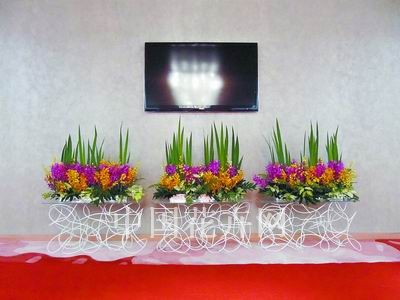 ▲世博文化中心貴賓休息室電視及墻面下段擺花。采用線條型金屬制作的花架,盡顯時尚。