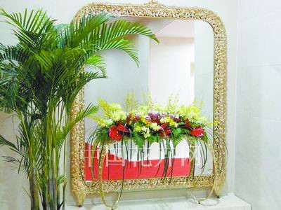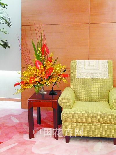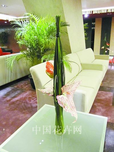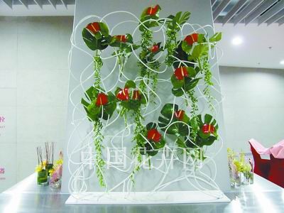▲貴賓休息室墻邊擺花。線條型金屬制作的支架與花融為一體。