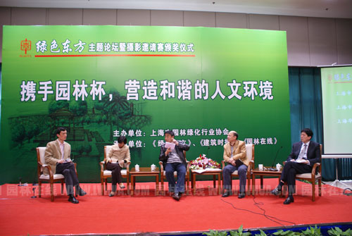 最后,由上海市綠委辦秘書處處長高級工程師李莉、上海園林設計院副總工、高級工程師范善華、上海華潤投資發展有限公司總經理陸德潤、文匯報高級記者洪崇恩、《園林在線》副總經理翁靈巍等五位嘉賓在臺上就園林建設認知誤區 、當前建設與管理中的矛盾、建設方希望政府提供的技術或政策標準上的支持、如何合理有效地投資景觀建設展開討論,并和臺下觀眾進行問答式溝通,為業界如何實現“設計——施工——生產”提供了良好的互動平臺。