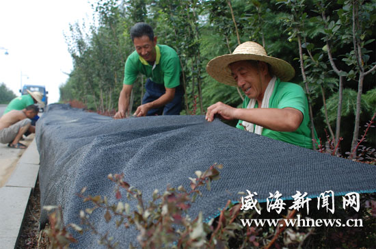 為避免夏季烈日對綠化植物造成傷害,我市園林工人冒著酷暑對市區(qū)一些綠化帶覆蓋遮陽保護(hù)網(wǎng)。這是7月31日,記者在市區(qū)古山五巷拍攝的鏡頭。(記者 王曉 攝)