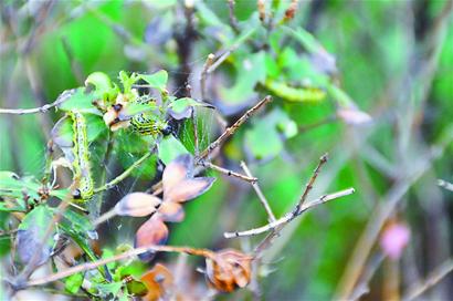 上午,記者趕到世紀佳園,看到了市民所說的“毛毛蟲”。小區(qū)2號樓前的綠籬損失尤為慘重,順著六七十米長的矮冬青看過去,幾乎每隔幾步都能發(fā)現(xiàn)啃食樹的“毛毛蟲”。這些“毛毛蟲”通體綠色,它們爬過的地方,幾乎都能看到密集的“白網(wǎng)”。不少被蠶食過的矮冬青,葉子灰黃,有的甚至已經(jīng)死去!坝腥苏f這蟲子是美國白蛾,有人說這蟲子像‘吊死鬼’!币粯I(yè)主說。