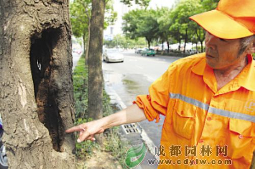 由于手邊沒有什么滅火工具,他急中生智,用手中的簸箕舀了路邊的積水就往樹上澆,“當時也找不到水源,可能是灑水車經過時留下的一灘水正好在旁邊,我就用簸箕舀了來滅火。”孫師傅告訴記者,隨后他又發現明火是從樹干上的一個樹洞里冒出來的,但是水澆進去,不一會火苗又冒上來了。這時,看到煙霧的古南都飯店工作人員也拿著滅火器出來滅火,這才把火撲滅。