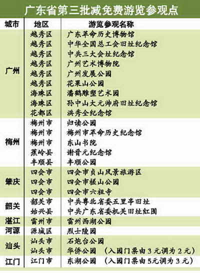 在此基礎(chǔ)上,省物價(jià)局再次向社會(huì)公布了全省第三批免費(fèi)游覽參觀點(diǎn)名單共計(jì)22個(gè)單位,共涉及廣州、梅州、肇慶、韶關(guān)、湛江、河源、汕頭、江門等8個(gè)市(名單見附表)。此前,2009年5月1日,廣東首批推出了174個(gè)免費(fèi)游覽參觀點(diǎn);同年10月1日,省物價(jià)局又再次推出第二批361家免費(fèi)游覽參觀點(diǎn)。