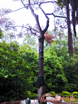 記者昨日從黃花崗公園獲悉,經(jīng)過來自華南農(nóng)業(yè)大學(xué)、廣東省林業(yè)科學(xué)研究院、廣州市園林科學(xué)研究所的專家和學(xué)者的會(huì)診,確定黃花崗公園百歲“病松”的致病原因是由于已屆高齡和氣候影響致該樹“根部較弱”。目前,該園已在市園林科研所的幫助下對該樹進(jìn)行養(yǎng)護(hù),主要措施是松土、換泥、補(bǔ)充營養(yǎng)。