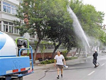 工作人員在八緯路為白蠟樹噴灑藥物。龐 劍 王宏林 攝
