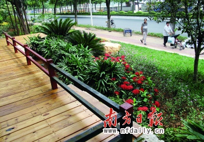 “圍墻”變身為開放式綠地,其內種植了木槿、桂花、雞蛋花、黃蟬、長春花等88種植物。負責此次“拆圍透綠”工程的廣州市綠化公司園林設計所所長雷杰告訴記者,在設計時他們刻意搭配了不同花期的開花植物,春天的紫荊花,夏天的雞蛋花,秋天的桂花、龍船花,冬天的矮牽牛……讓公園一年四季有鮮花,四季景象都有所不同。
