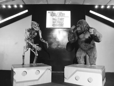 有一組機器人名為“兩只猩猩的對話”,一個看上去和猩猩一樣,另一個看上去滿身是線路。原來這個裸機器人加上外套就是那個猩猩。通過這一組機器人,游客可以清楚地了解到機器人的內部結構。原來這些機器人的關節都是靠氣體來推動的,氣動機器人要比電動機器人靈活多變。