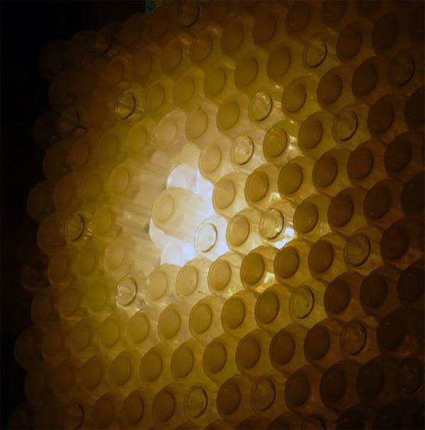 ▲由遠東集團贊助興建之流行館,外墻使用回收數(shù)百萬個寶特瓶再制成寶特磚, PET瓶內(nèi)裝的空氣提供保溫效果及阻熱效果,實踐3R之理念。